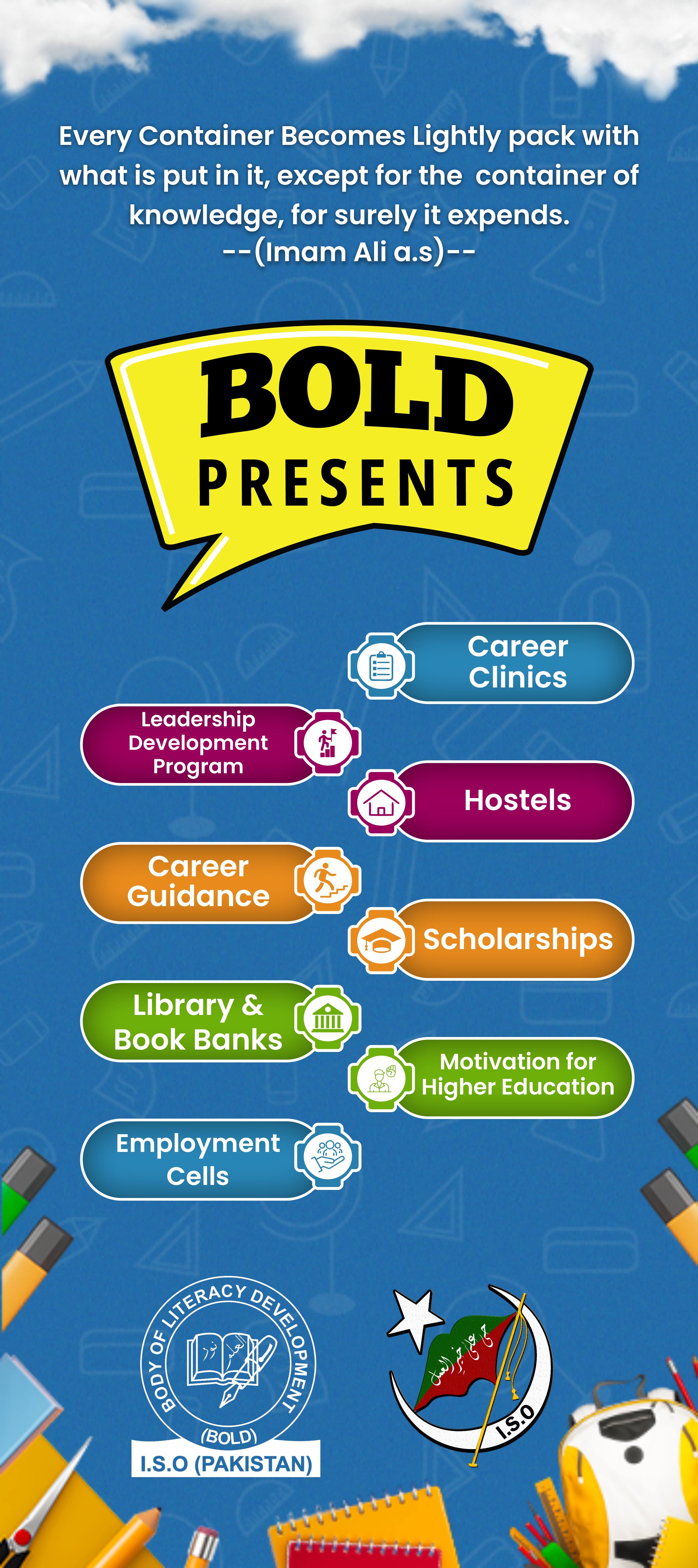 Body of literacy development (BOLD) is an educational Institute of Imamia student organization Pakistan working to promote, facilitate and motivate the students for higher education. It was established in 1987 to uplift the students in education. BOLD has been helped thousands of the students who have completed their education and serving the nation